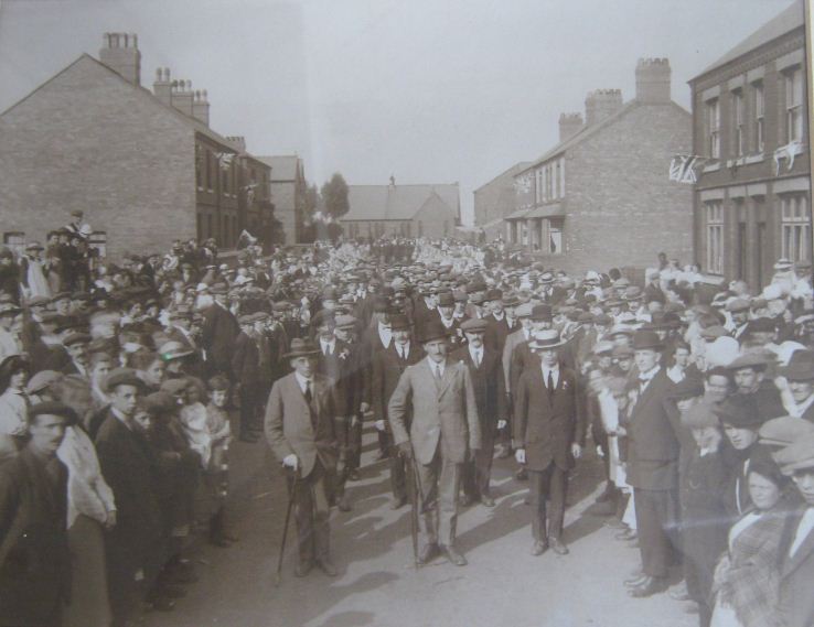1919 Victory Parade. This photograph shows ex-servicemen walking down School Street. The building at the far end is the Welsh Congregational Chapel (now demolished)